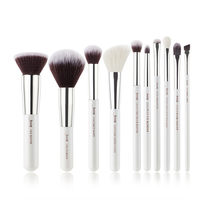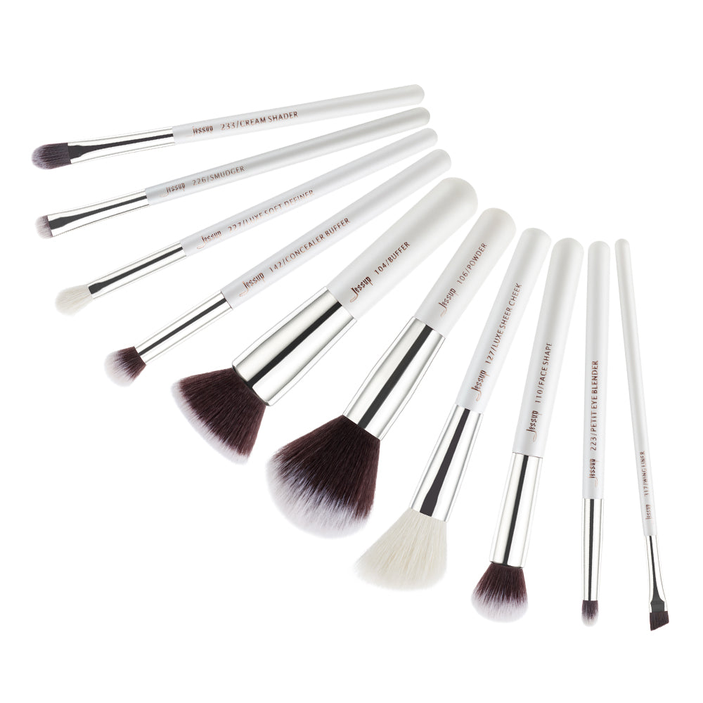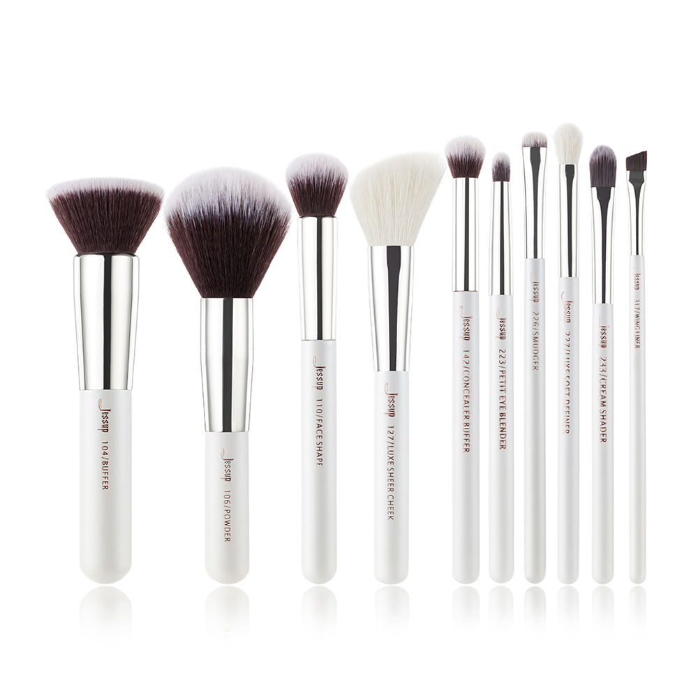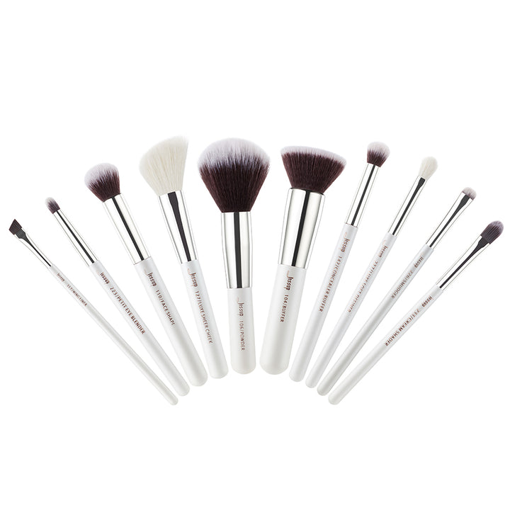 Set di 10 pennelli da trucco professionali Jessup Brand Pearl White/Silver, kit di strumenti per pennelli da trucco, fondotinta, cipria, tampone, ombretto per guance