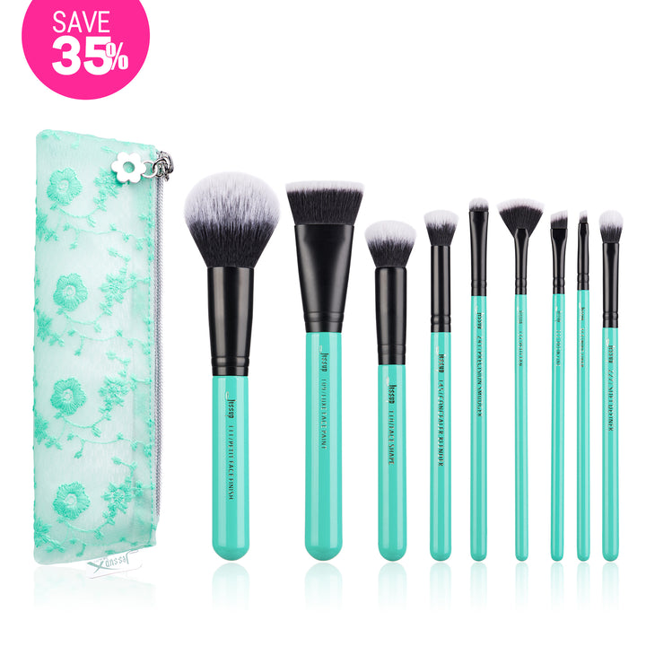 The Jessup turquoise set includes 9 essential brushes for complete makeup looks for every day, from foundation, powder and blush to intricate eye makeup. Perfect for the professional and beginner alike. Our brushes features premium soft, synthetic bristles encased in a black ferrule atop a green handle, making them not only functional but a beautiful addition to your vanity.
